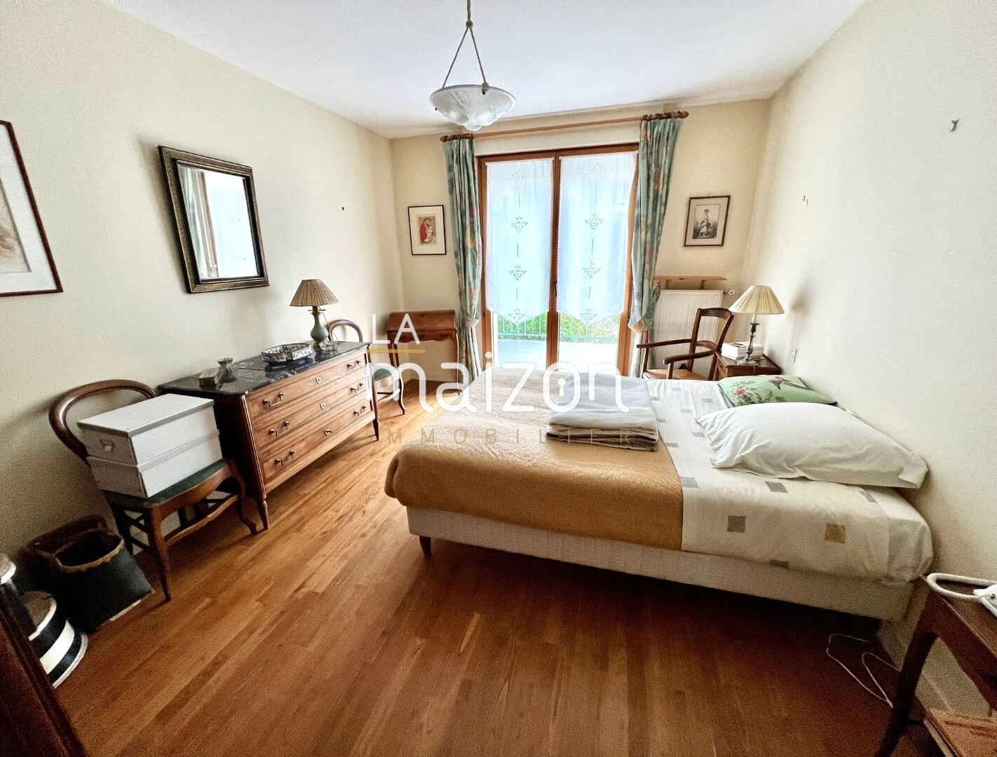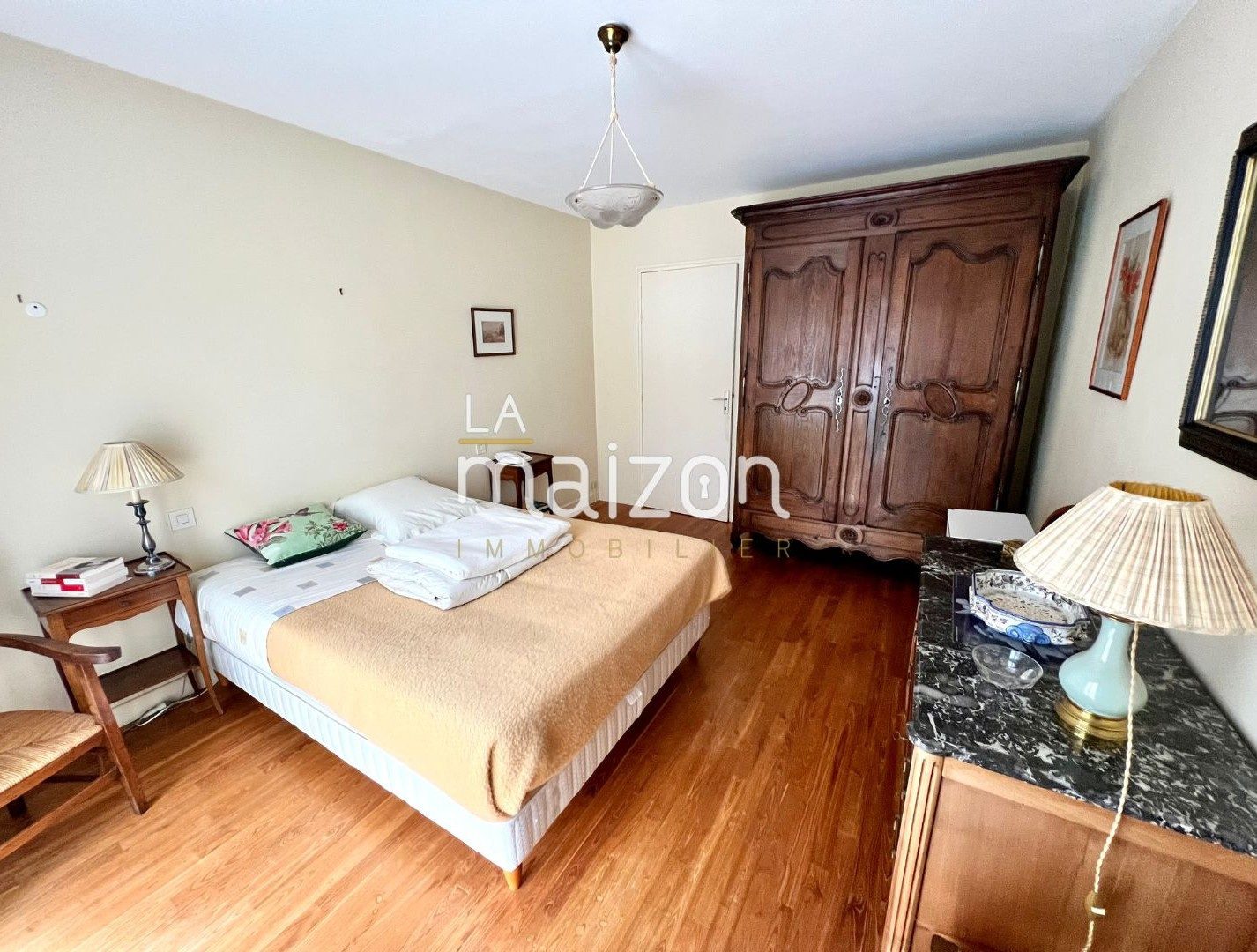 Elle offre: un grand salon séjour avec cheminée, la cuisine fermée (mais qui peut etre ouverte), aménagée et équipée et une première grande chambre avec dressing. Ces pièces de vie offrent toutes un accès sur la terrasse menant également au jardin.