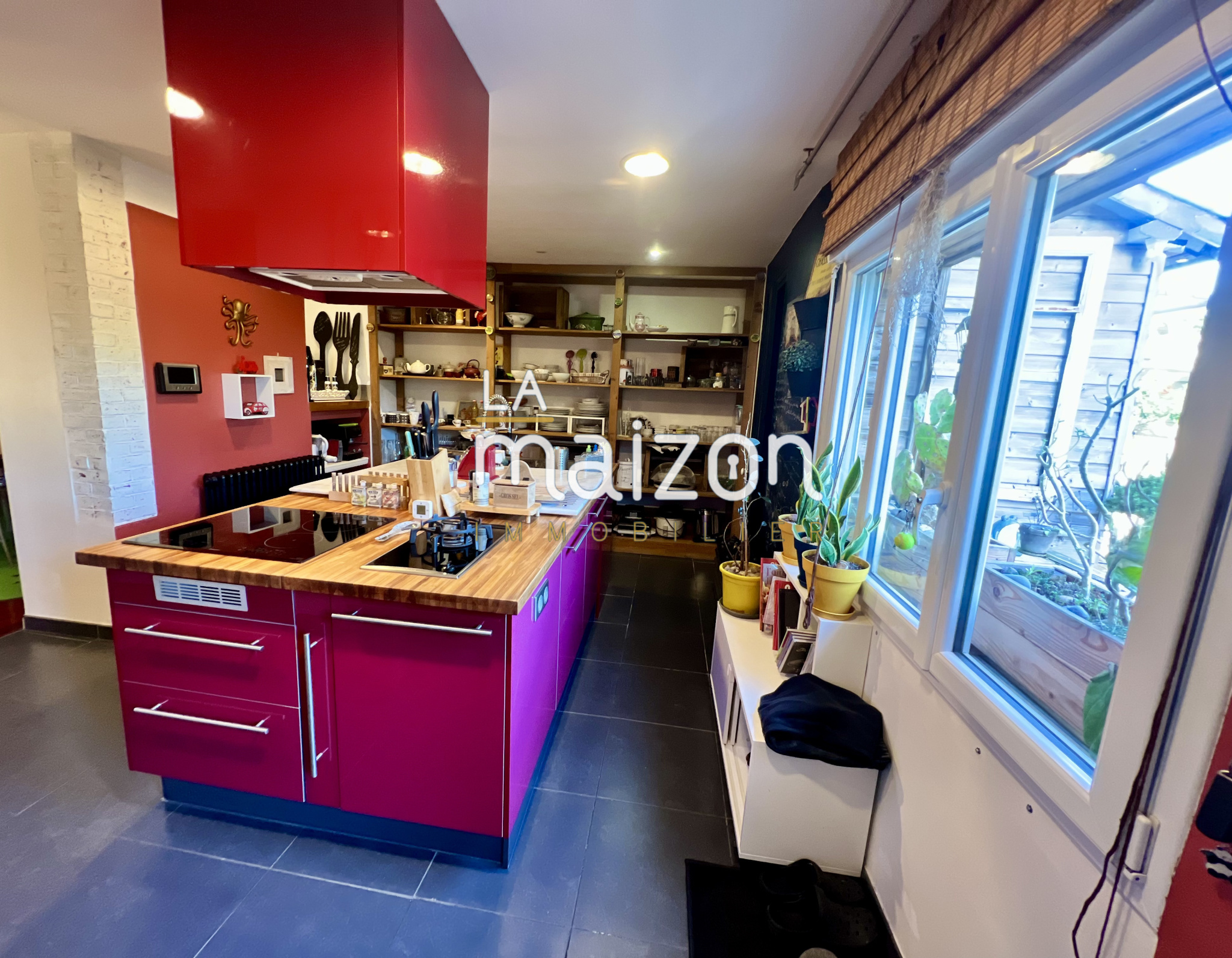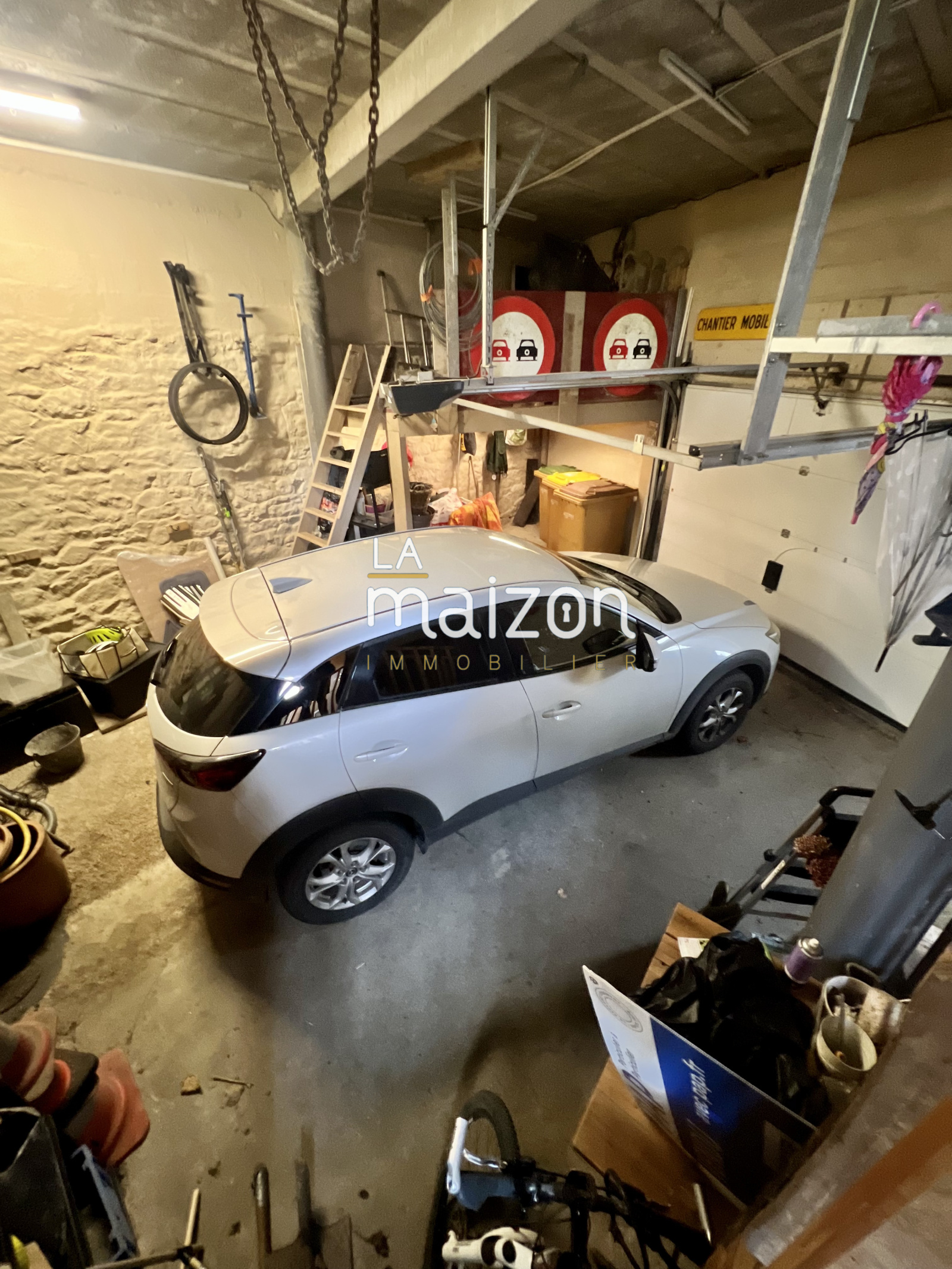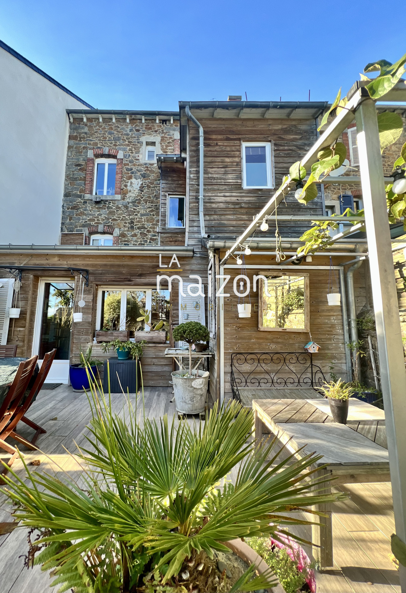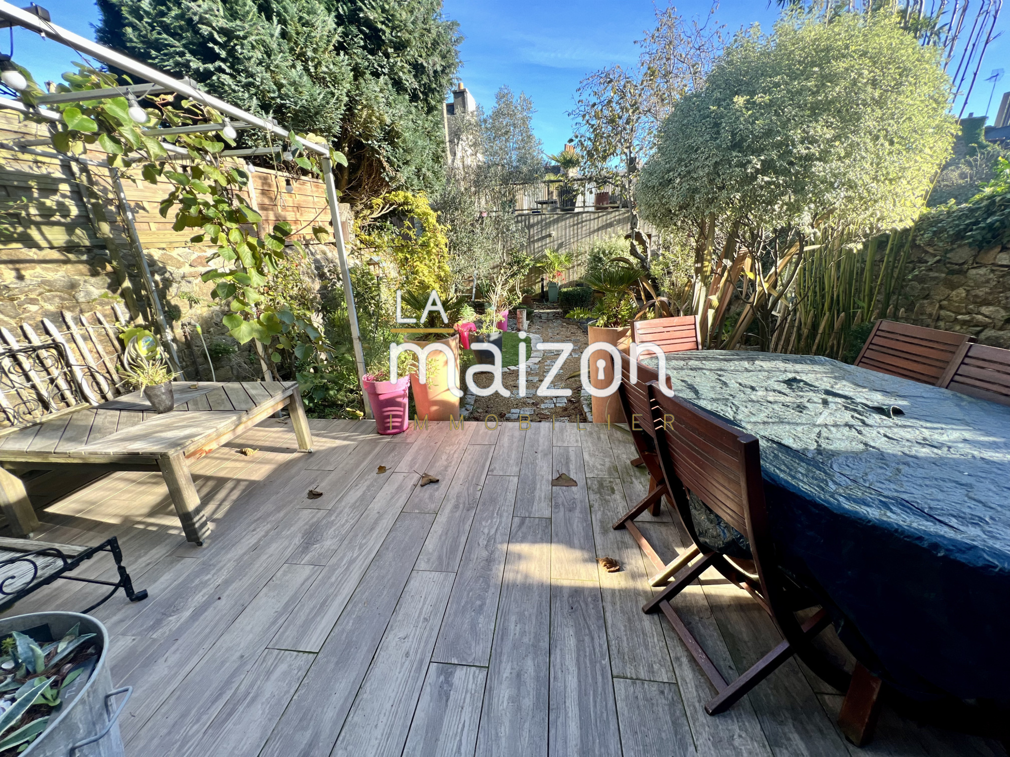 Par la cuisine on accède enfin au jardin. Deux belles terrasses en bois tronent et offre un dépaysement total pour une maison de ville. Un grand garage (voire très grand) est surplombé par une terrasse originale et baignée de soleil.